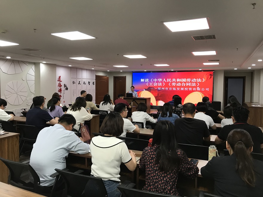 根據(jù)《2021年鄭州市普法依法治理工作要點》文件精神和市國資委關于普法教育工作要求,為扎實推進普法依法治理工作,為“八五”普法開好局、起好步,5月13日下午,鄭州市市場發(fā)展投資有限公司組織開展《中華人民共和國勞動法》《工會法》《勞動合同法》等法律知識講座,公司本部全體人員、各子公司中層以上管理人員及法務部、經(jīng)營部工作人員參加培訓。